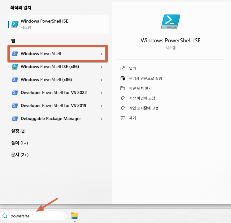 작업 표시줄에서 powershell 로 검색 후, Windows PowerShell 을 실행한다.
