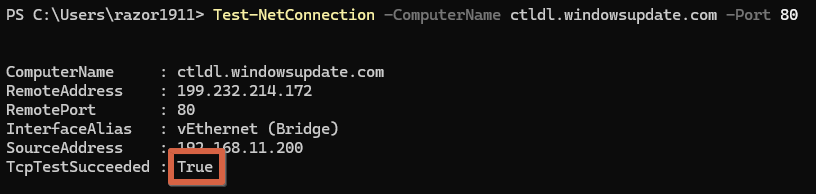 Test-NetConnection -ComputerName ctldl.windowsupdate.com -Port 80