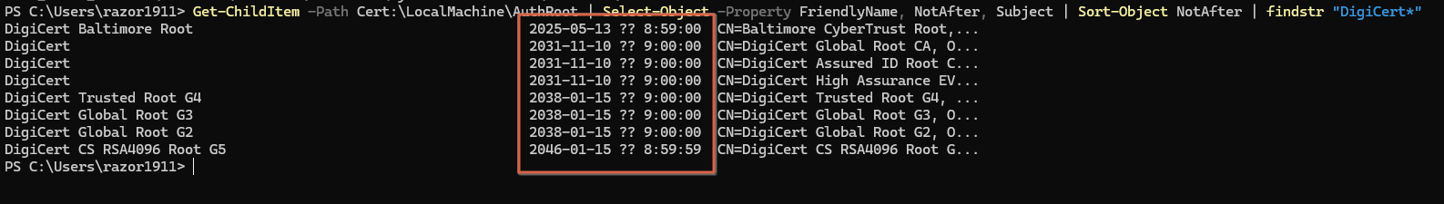 Get-ChildItem -Path Cert:\LocalMachine\AuthRoot | Select-Object -Property FriendlyName, NotAfter, Subject | Sort-Object NotAfter | findstr "DigiCert*"