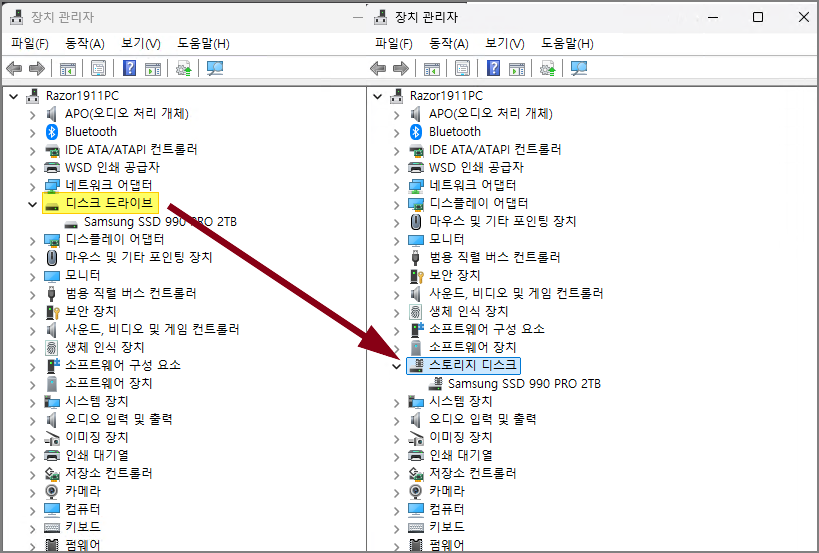 이 기능이 적용되면 장치 관리자에서 디스크 드라이브가 스토리지 디스크로 바뀐다.