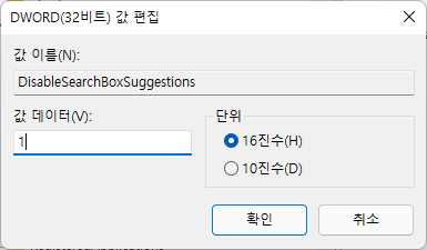새로 만들기 > DWORD(32비트) 값 > DisableSearchBoxSuggestions 생성