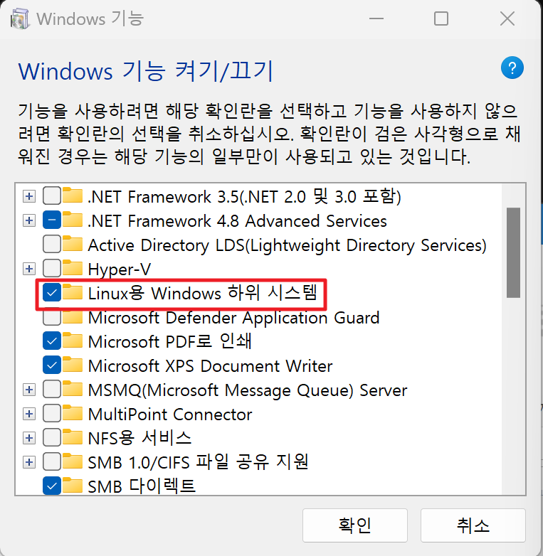 Linux용 Windows 하위 시스템 기능이 꺼져 있음.