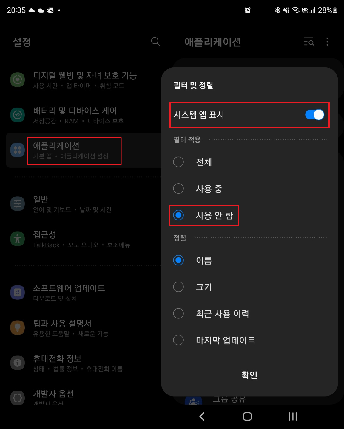 개발자 옵션 > USB 디버깅 설정을 ON 한다.