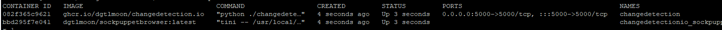 8b8141806946 ghcr.io/dgtlmoon/changedetection.io "python ./changedete…" 7 minutes ago Up 7 minutes 127.0.0.1:5000->5000/tcp changedetection