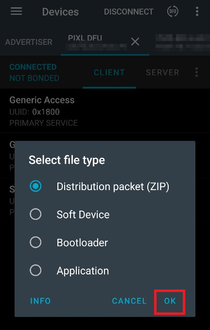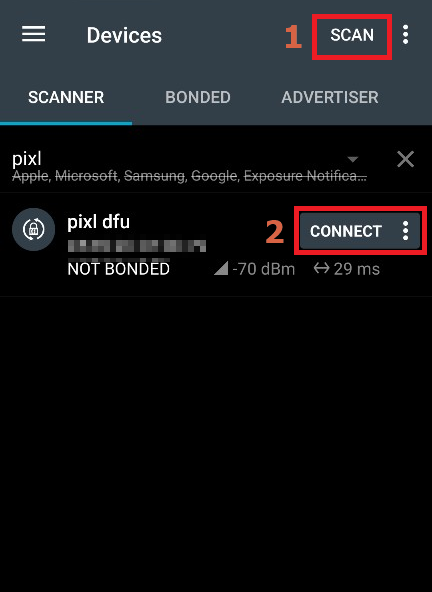 그 중, pixl dfu 를 찾아서 connect 를 누른다. DFU 모드는 20초만 유지되므로 pixl dfu 가 검색이 되지 않을 수 있다.