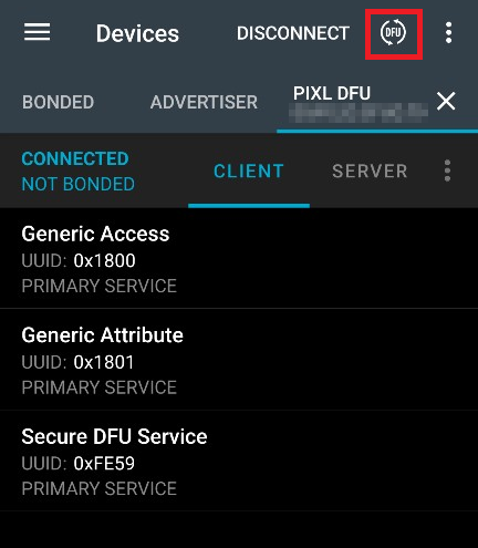 6. 정상적으로 연결이 되면 DFU 버튼이 활성화 된다.